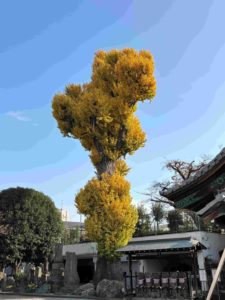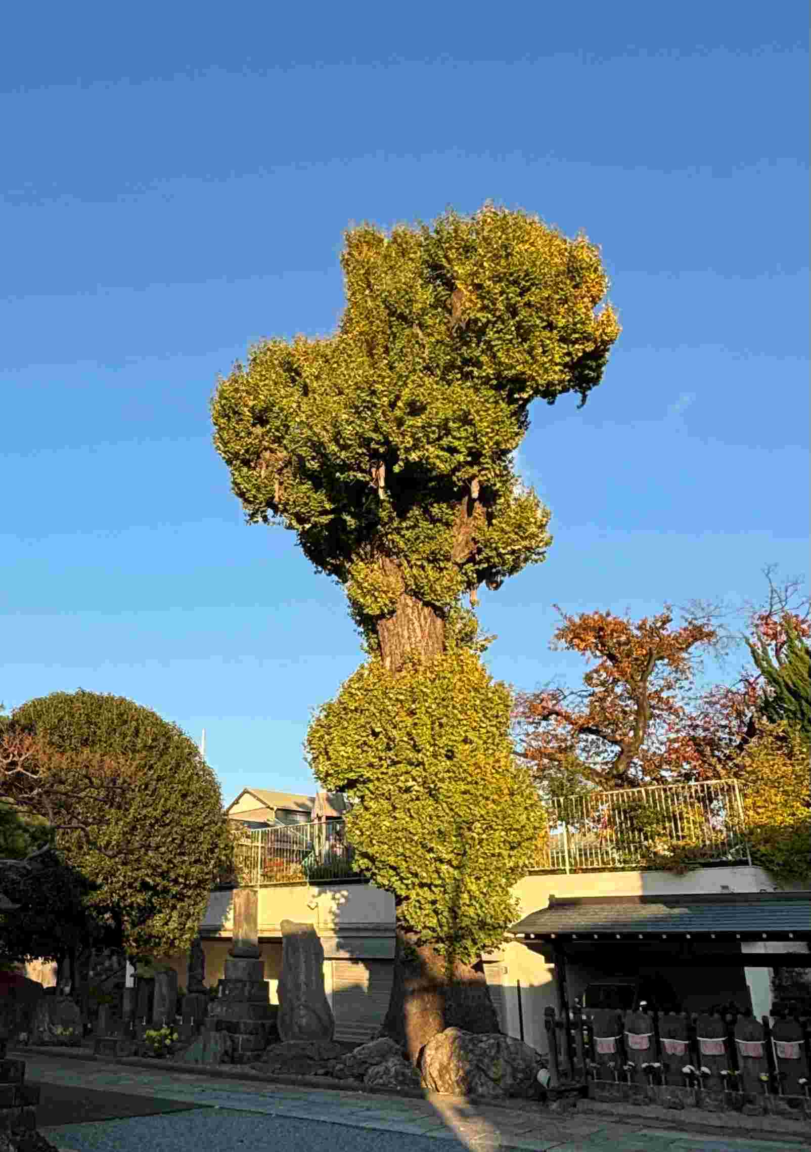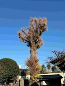 近くのお寺のイチョウは老木で、何があったか分かりませんが途中で切ってあります。